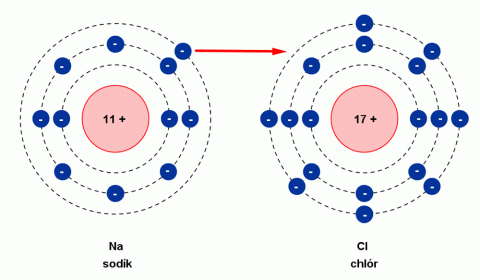 Molekula NaCl vzniká sloučením atomu sodíku Na s atomem chloru Cl. Při vzniku molekuly NaCl přešel elektron z elektronového obalu atomu sodíku do elektronového obalu atomu chloru. To má za následek vznik dvou částic s nábojem – iontů (název iont pochází od Michaela Faradaye). Atom sodíku přitom odevzdal jeden elektron a vytvořil kladný iont (Na+). Atom chloru jeden elektron přijal a vytvořil záporný iont (Cl-). Ionty s opačnými náboji se přitahují elektrickými silami a vytvářejí pravidelnou strukturu krystalu chloridu sodného – tzv. iontovou vazbu.