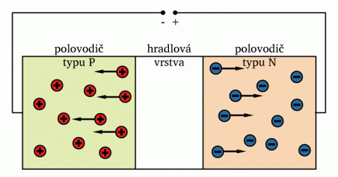 Polovodičová dioda je tvořena jedním přechodem PN. V okamžiku, kdy vznikne přechod PN, začnou neuspořádaným tepelným pohybem pronikat díry do polovodiče typu N a naopak z tohoto typu polovodiče přecházejí elektrony do polovodiče typu P. Při setkání volného elektronu a díry zaplní volný elektron díru. Tím zanikne díra a volný elektron se stane vázaným. Zánikem děr a elektronů se postupně snižuje v přechodu PN počet volných elektronů a děr. Nakonec je v přechodu podstatně méně děr a volných elektronů než původně. V přechodu téměř chybějí částice, které by mohly vést proud. Přechod PN je velmi tenká vrstva, která působí jako izolant. Vzniká tzv. hradlová vrstva, v níž působí elektrické pole z oblasti N do oblasti P a brání pohybu volných nábojů. Polovodičová dioda se chová podle toho, jak ji zapojíme do obvodu. V propustném směru je spojen polovodič typu P s kladným pólem zdroje a polovodič typu N se záporným pólem zdroje. Při zapojení diody v tomto směru směřují volné elektrony i díry k přechodu, tj. velikost hradlové vrstvy se zmenšuje. Vnější elektrické pole tedy umožnilo, aby volné elektrony a díry pronikly velmi tenkou vrstvou přechodu a diodou procházel dlouhodobě elektrický proud.
