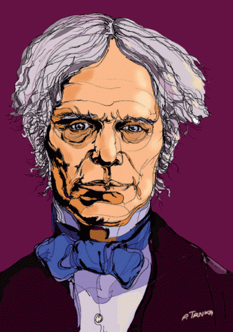 - Vytvořil soustavu dvou cívek na společném železném prstenci. Když pak do jedné přivedl přes spínač elektrický proud z baterie, tak se magnetka (rovnoběžně umístěná pod vodorovným drátem spojujícím konce druhé cívky) vychýlila a poté se vrátila do původní polohy. Po přerušení proudu v první cívce se magnetka vychýlila na opačnou stranu a vrátil a zpět.