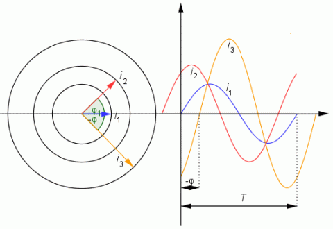 Parametry obvodu střídavého proudu působí nejen na velikost proudu, ale ovlivňují také jeho fázi. Je to veličina, která určuje hodnotu napětí a proudu v obvodu v počátečním okamžiku. Vyjadřuje se jako úhel buď ve stupních nebo v radiánech. Důležitá je hodnota rozdílu mezi počáteční fází napětí a počáteční fází proudu. Je to fázový rozdíl nebo také fázový posun φ střídavého napětí a proudu. Může být kladný nebo záporný. Na obrázku jsou znázorněny tři proudy vzájemně ve fázi a s fázovým posunem ±φ.