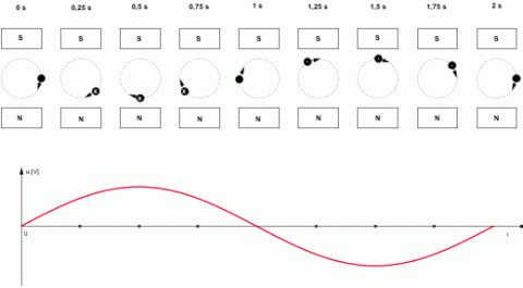 V času 0 s se vodič pohybuje ve směru indukčních čar, neprotíná téměř žádné magnetické indukční čáry a ve vodiči žádné napětí nevzniká. V čase 0,25 s už vodič protíná více magnetických indukčních čar, a proto se ve vodiči indukuje napětí a jemu odpovídají proud směřující od nás. V čase 0,5 s protíná vodič nejvíce indukčních čar, a proto se indukuje největší napětí tzv. amplituda napětí. Podobně projdeme celou jednu otočku vodiče.