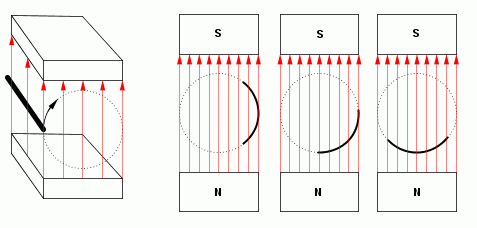 Pohybuje–li se vodič v magnetickém poli po kruhové dráze, můžeme jeho pohyb rozdělit na jednotlivé úseky a sledovat, kolik indukčních čar vodič protne za stejnou dobu. Z obrázku je zřejmé, že nejméně čar protne v prvním případě a nejvíce čar v posledním případě. Čím více indukčních čar vodič protne, tím větší napětí se v něm indukuje. Je tedy zřejmé, že při pohybu znázorněném na obrázku bude velikost indukovaného napětí vzrůstat.