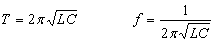 a dále příslušný vztah (nazývaný též vztah Thomsonův po Williamu Thomsonovi, který se vybíjením kondenzátoru přes cívku teoreticky zabýval) pro rezonanční periodu a frekvenci střídavého proudu
