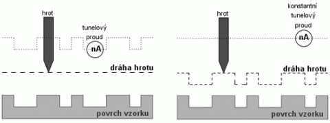 Vzdálenost mezi hrotem a povrchem materiálu představuje potenciálovou bariéru. Jehla je umístěna od povrchu vzorku ve vzdálenosti menší než 1 nm. Tunelový jev způsobuje, že některé elektrony pronikají povrchem hrotu jehly a povrchem zkoumaného vzorku a vytvářejí v úzké mezeře mezi jehlou a vzorkem elektronový oblak. Vložíme–li mezi sledovaný vzorek a jehlu elektrické napětí, protéká v mezeře tunelový proud, který klesá exponenciálně se vzdáleností jehly od vzorku. Podle režimu měření může být měřený signál dvojího druhu. U režimu s konstantní výškou se udržuje nastavená hodnota výšky hrotu a měří se velikost tunelového proudu. Tento režim umožňuje rychlé snímání obrazu, protože není nutné pohybovat vzorkem, ale je méně přesný, neboť při velkých vzdálenostech hrotu od povrchu se proud dostává pod dobře měřitelnou úroveň. V režimu s konstantním proudem se stálá úroveň proudu udržuje pomocí zpětné vazby. Měronosnou veličinou je napětí přikládané k pohybovým prvkům z piezoelektrické keramiky. Tento režim je sice pomalejší, ale umožňuje sledovat větší změny profilu povrchu.