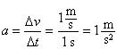 kde Δ označuje změnu nebo také přírůstek rychlosti rovnoměrně zrychleného pohybu, tj. rozdíl mezi konečnou rychlostí v2 a počáteční rychlostí v1, tedy Δv = v2 − v1. Vztah platí jen za předpokladu, že se rychlost rovnoměrně zvyšuje po celou dobu Δt. Veličina, kterou jsme označili a, byla později nazvána zrychlení (accelaratio). Dosazením do definičního vztahu získáme jednotku