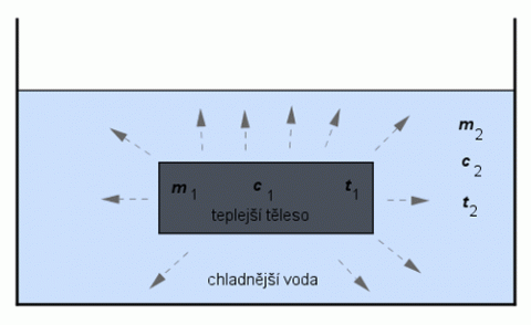 Při tepelné výměně odevzdá teplejší těleso kapalině teplo Q1 = c1m1Δt1. Kapalina přijme teplo Q2 = c2m2Δt2. Ze zákona zachování energie plyne pro izolovanou soustavu, že úbytek vnitřní energie tělesa se rovná přírůstku vnitřní energie kapaliny tedy Q1 = Q2 nebo–li