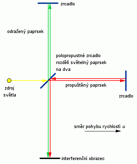 Podle éterové teorie mělo být naměřeno posunutí interferenčních proužků, ale nebylo. Proč? Odpověď najdeme v jednoduché úvaze. Rychlost propuštěného paprsku je c – u a po odrazu c + u, doba za jakou dopadne paprsek na stínítko
